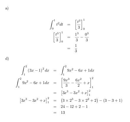 d) is essentially the same, you just have a more complex expression to integrate in the first place. Multiply out the bracket first, then integrate, then evaluate at the limits and subtract.